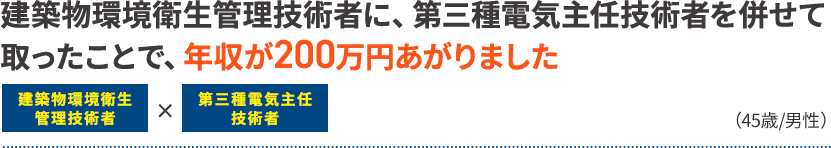 建築物環境衛管理技術者と併せて、第三種電気主任技術者の資格を取得することで、作業員の統括をするマネジメント職へキャリアアップできて年収が200万ほどあがりました。